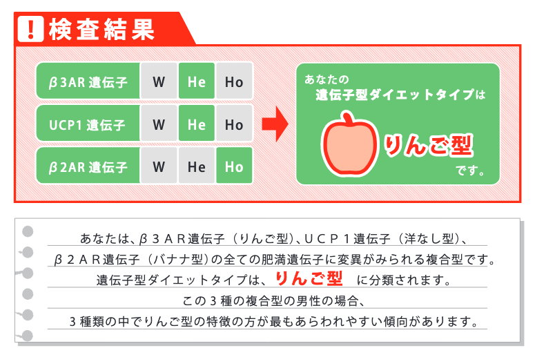 気になる結果だが「りんご型・糖質の過剰摂取により内臓脂肪型肥満になりやすいタイプ」とのこと。確かに自分でも、心当たりがあり、炭水化物の摂取量で体重が増減する印象があったので、これからはロカボ(糖質制限)を中心に頑張ろうと思う。