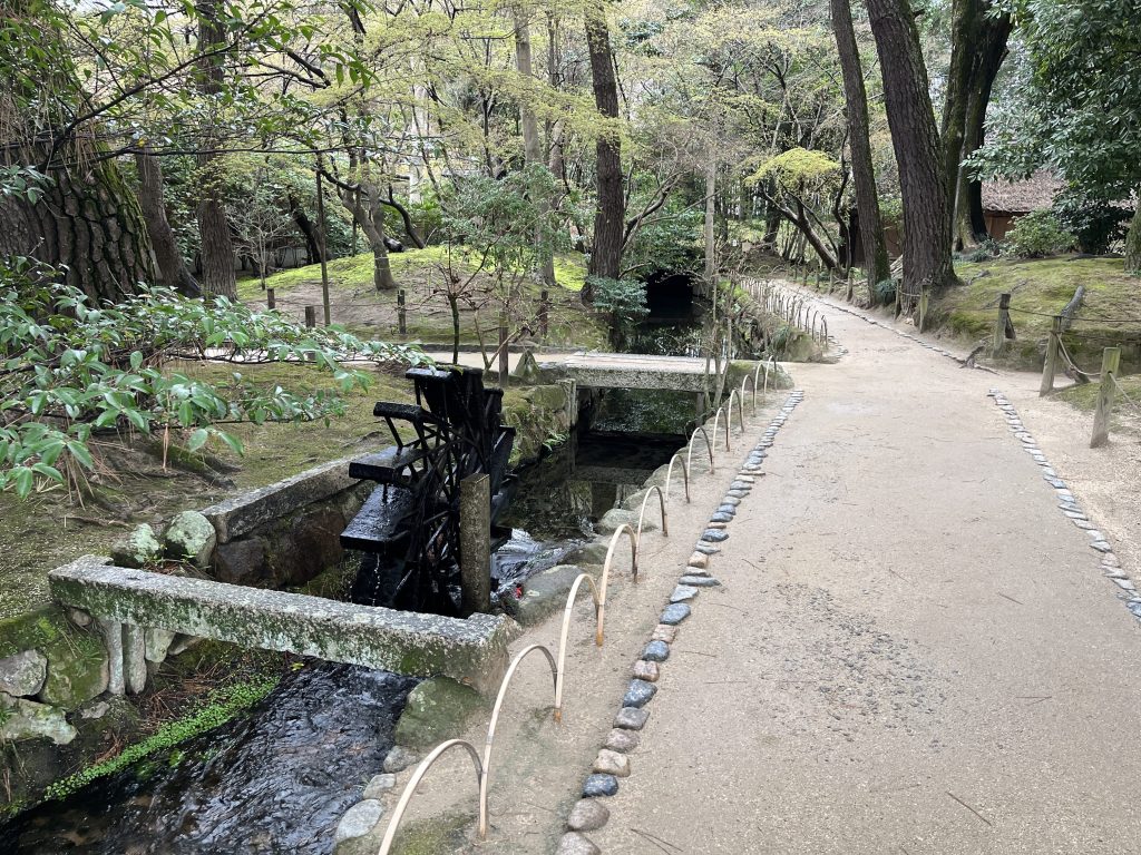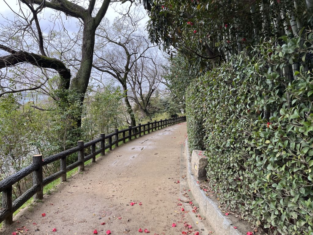 川向かいの後楽園側の歩道は、景色は悪くないものの、舗装されておらず、道も広くない。