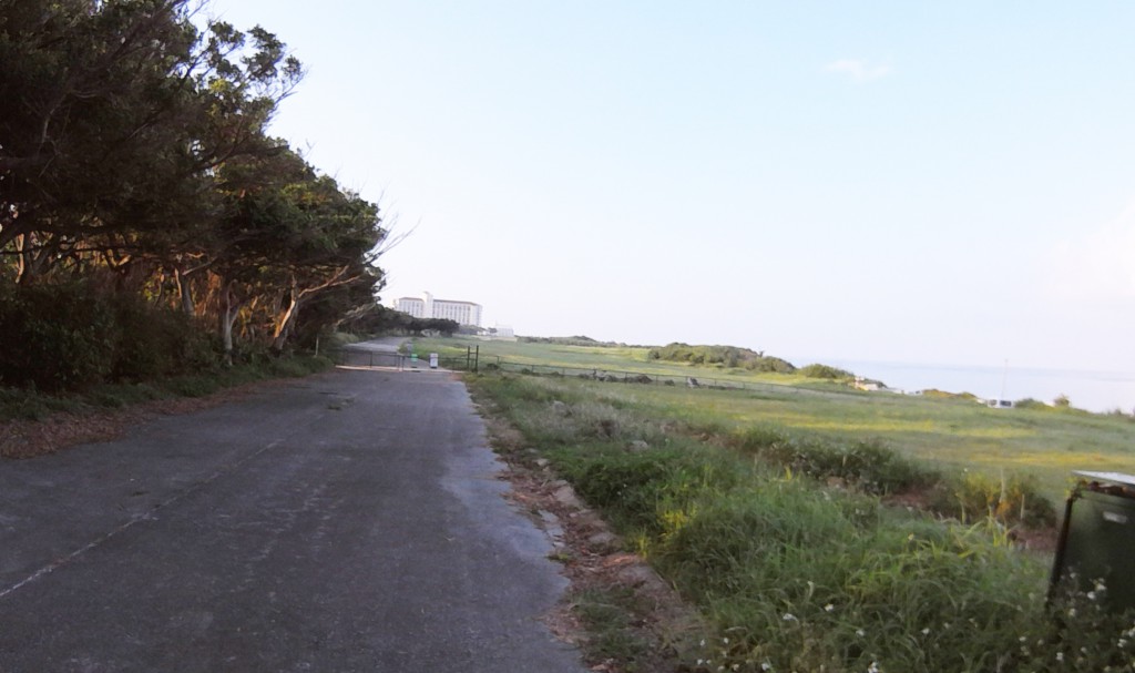 地図を見ると、宿泊先の半島の突端でもある残波岬まで行くコースが良さそうだったので、こちらの方向に走るルートを選んだ。サトウキビ畑や海沿いの中を走るのだが、柵が所々にあり、車が入れなくなっており、信号もないので走りやすい。また、灯台に向かっての走行なので、モチベーションも高く保つ事ができる。