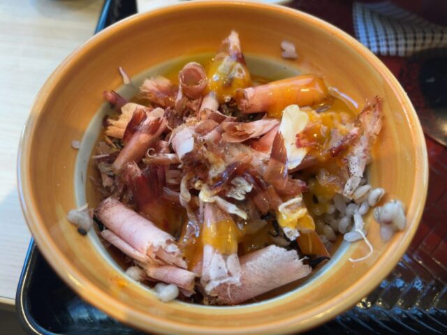 残りの半分におかかごはんセットの、おかかをまぶし、黄身とタレを混ぜ合わせてその上にかける。