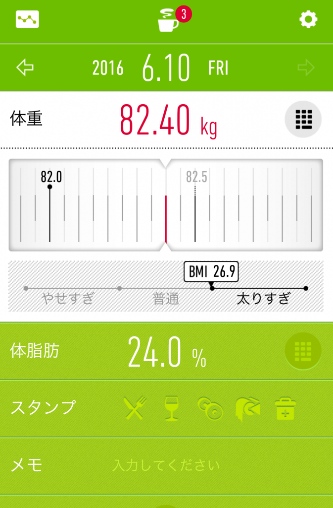 体重管理は、ここ数年大会前に「TANITAからだカルテ」という、ガラケーのサイトを使っていた。データはクラウドで保存されるので、機種を変えても、そのまま利用でき大変便利だった。ただ、ガラケーなので、接続に時間がかかったり、その都度、確認のウィンドウがでるため、オフシーズンは面倒で使っていなかった。