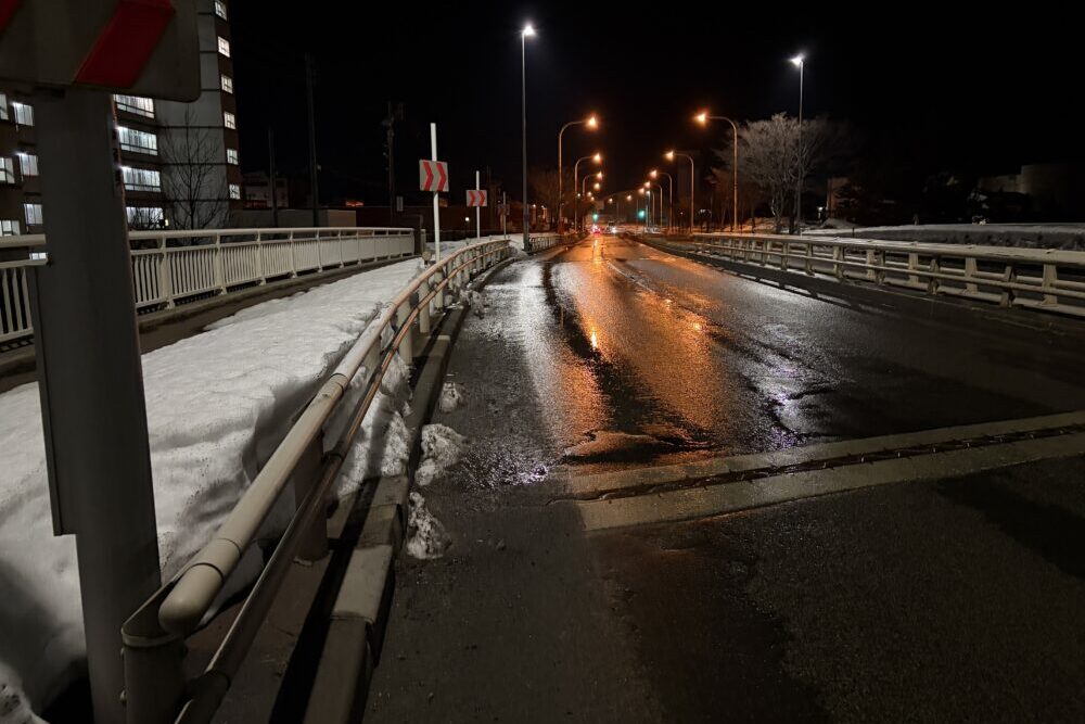 店でギリギリまで粘ったものの、出航まではまだ時間がある。酔い覚ましにフェリーターミナルまで歩くことにしたが、これがなかなかの冒険だった。晴れてはいたが路肩は雪で埋もれており、夜道で車道を歩かざるを得ない場面も。冬の深夜、このルートの徒歩移動は正直おすすめできない。