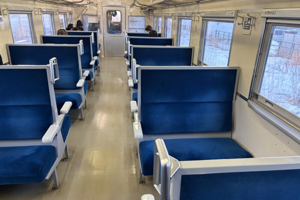 函館港に6:10到着後、徒歩で七重浜駅へ。ゆっくり歩いても発車10分前には到着。6:44発の「道南いさりび鉄道」に乗車。懐かしい青いボックスシートに、弾む旅心。