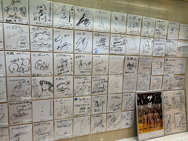 設備や外気浴スペースが充実で、通好みというのも理解できる。有名人のサインが壁一面に貼られており、オリジナルグッズまであった。